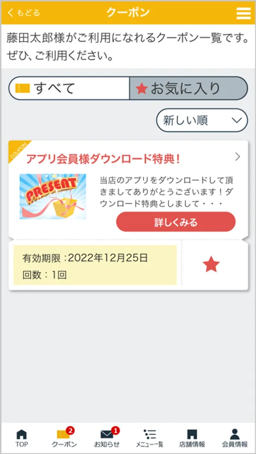 登録した店舗で実施中のキャンペーン情報や各種最新情報をお届けします。