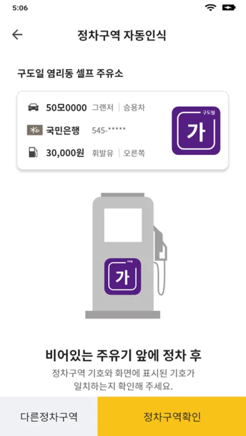 주유기 앞에 정차 후 해당 주유기에 부착된 정차구역기호(가,나,다...)를 확인 후 스마트폰 화면에서 확인.