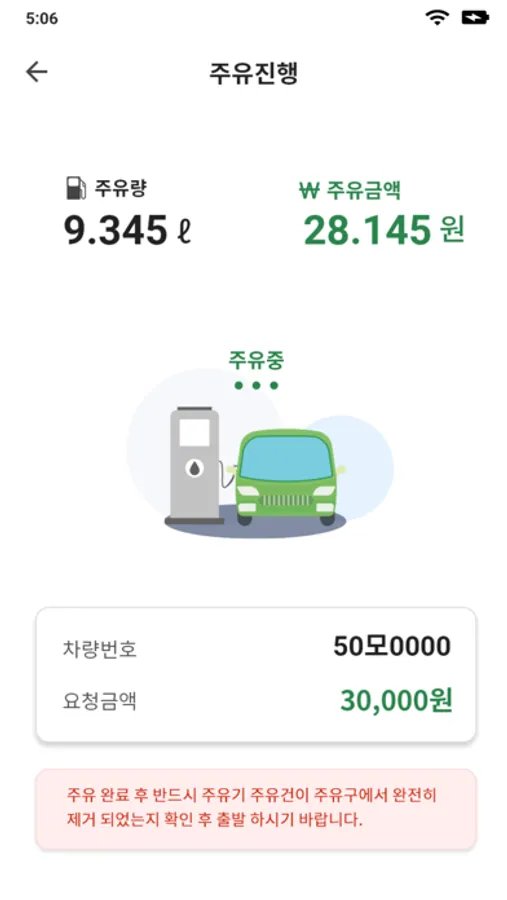 주유요청을 하면 주유 주문 정보가 주유기에 자동으로 세팅됩니다. 주유진행은 스마트폰 화면에서도 확인할 수 있습니다.