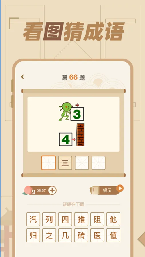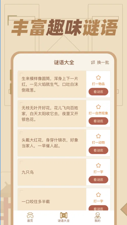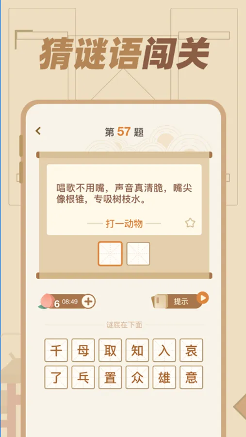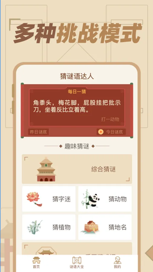 2.猜谜语达人包罗了数千个谜语题,有猜字谜、猜动物、猜植物、猜地名等,根据各种隐喻文字提示猜出谜底,通过关卡模式,让猜谜更具有挑战乐趣。