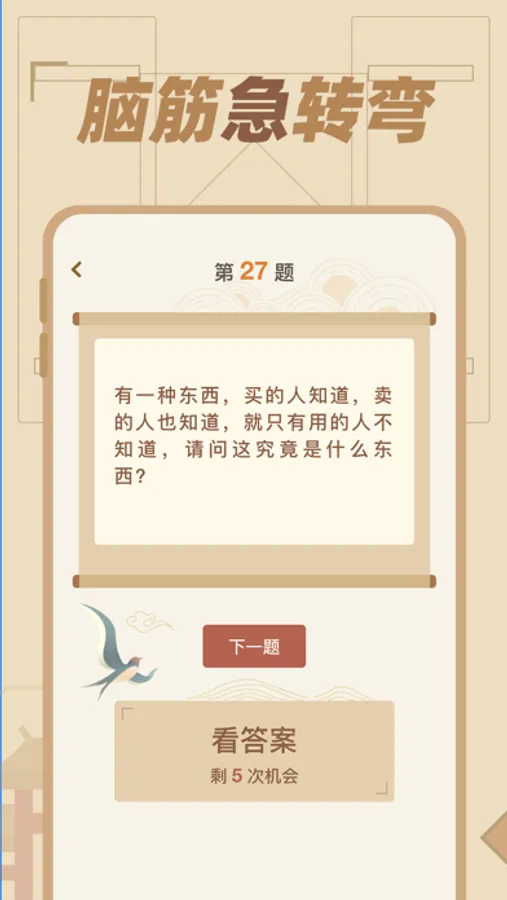 【脑筋急转弯】是帮助用户提升幽默感的秘密武器和开发大脑潜能的便捷工具,让用户在答题中获得乐趣,更在潜移默化中锻炼大脑思维,让你成为脑力达人。