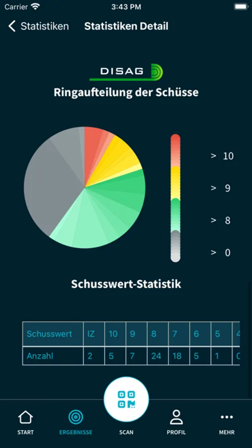 Die technische Aufbereitung deiner Ergebnisse. 10er, 9er,8er,…., Innenzehner, Durchschnitt, bester Teiler – alles übersichtlich dargestellt und bereit für eine Analyse.