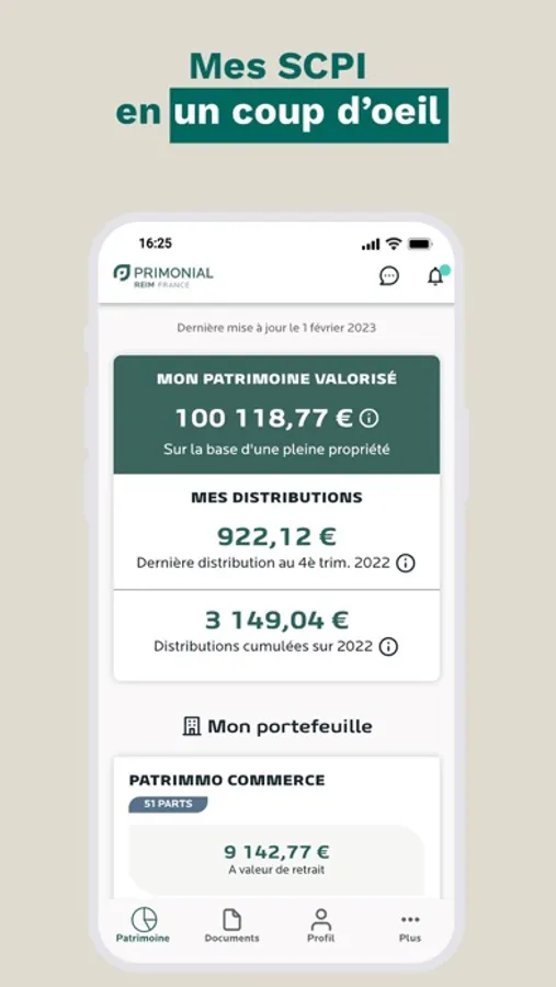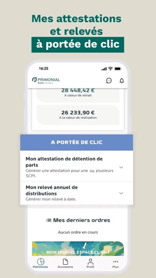 Elle permet de visualiser en un coup d’œil la synthèse de votre épargne immobilière chez Primonial REIM France. Vous y trouverez votre situation patrimoniale, le détail des produits détenus, votre attestation de parts, vos relevés de distribution ou encore vos documents fiscaux.