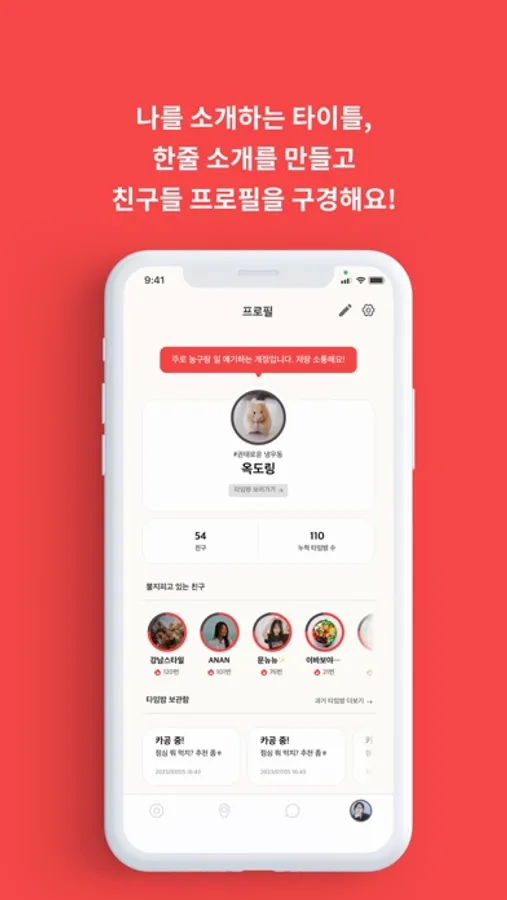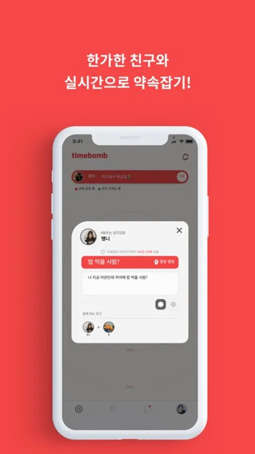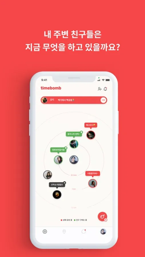 도보 30분 이내에 있는 친구들과의 거리를 실시간으로 확인하고 원하는 시간에 사라지는 타임밤으로 서로의 상태를 재미있게 공유하며 새롭게 소통해요!