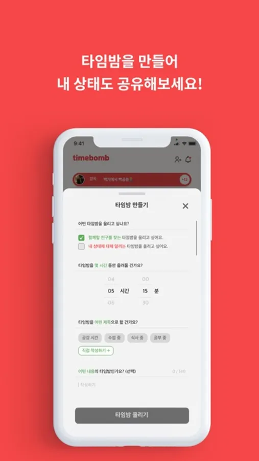 원하는 시간을 설정하여 그 시간이 지나면 자동으로 터지는 타임밤으로 시시각각 변하는 친구들의 상황을 확인하는 재미도 느낄 수 있어요!