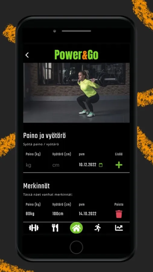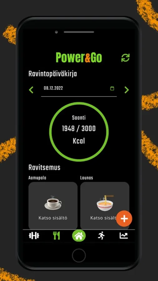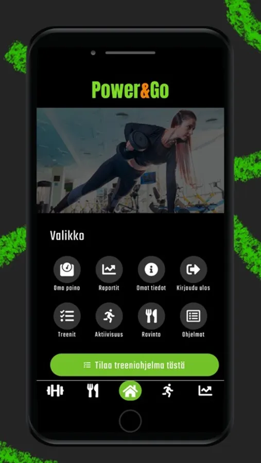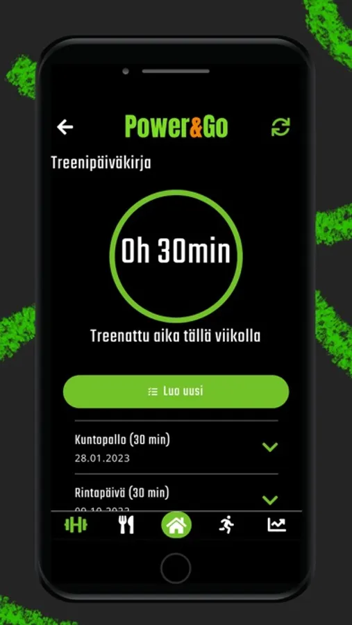 Power&Go treenisovelluksen raportointitoiminnallisuudella saat havainnollisia raportteja syöttämistäsi treeni-, aktiivisuus- ja ateriakirjauksistasi. Pystyt seuraamaan mm. miten suosikkiliikkeesi maksimivoimataso on kehittynyt tai miten paljon saat päivittäisestä ruokavaliostasi proteiineja, rasvoja tai hiilihydraatteja
