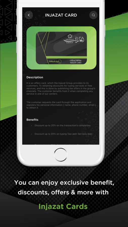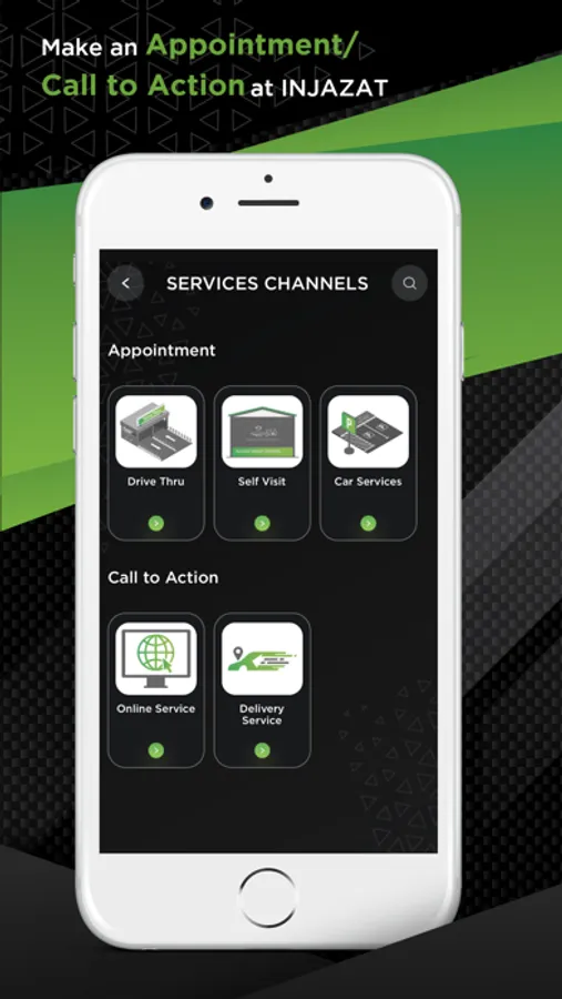 • Car Service : It is a service through which the service is requested and completed without the need to get out of the car , when you arrive at the center on the date you booked, you can notify an Injazat staff that you arrived on time outside the center by clicking on a specific button in the app or call a specific number, to go out to take your documents and complete the service while you are in the car.