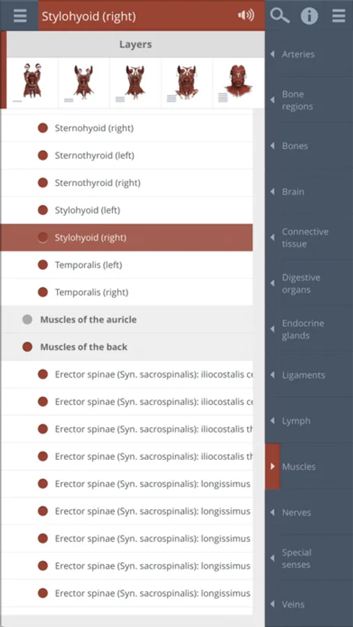 • The Contents folders arrange all 2,656 structures systemically, meaning you can browse by subcategory and switch all related structures on at once. It provides an excellent learning tool – for example turn on all branches of the facial artery, or the muscles of mastication.