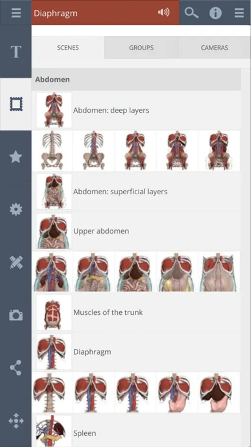 • The Gallery contains 22 pre-set scenes, designed by an in-house team of anatomical experts, to clearly and comprehensibly present in-depth regional and systemic anatomy of the abdomen. Each scene is divided into five layers to provide greater control over the depth of anatomy shown; making tailoring the anatomy you want to see simple and quick.