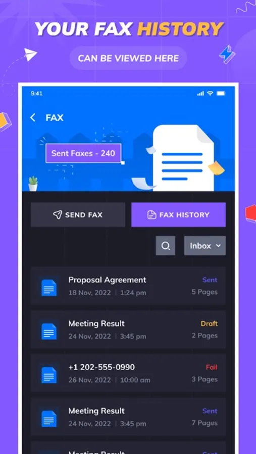 Receiving faxes is just as easy. Simply check the app for incoming faxes and view them directly from your device. The app will automatically notify you when a new fax arrives. The received faxes are stored securely in the app, making it easy to find and access them at any time.