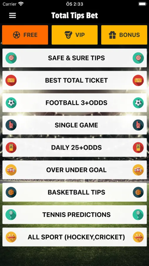 9 different free & vip betting tips section. Safe and sure picks, best total ticket, football 3+odds, tips of the day, 25+odds, over under goal, basketball tips, tennis predictions, all sport sections are free.