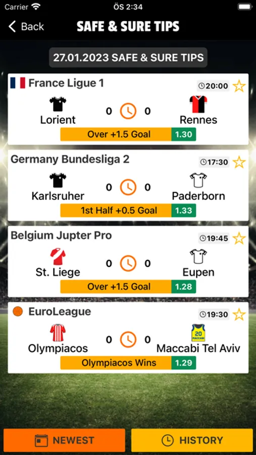 Choose your favourite betting tips in all sections. Click ''Star'' button in application and see your all favourite bets in same time. Use multiple betting tips together such as football predictions, basketball picks and tennis tips.