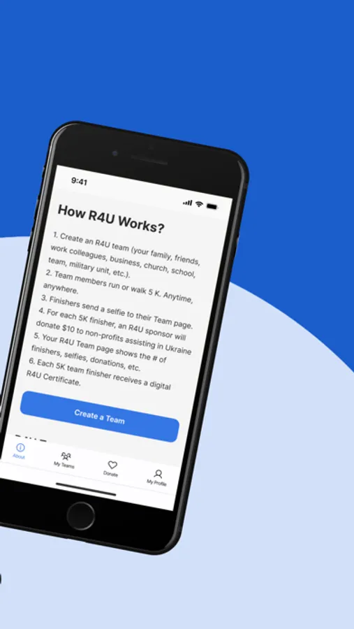 Create an RU4 team (your family, friends, work colleagues, business, church, school, class, sports team, military unit, etc.). Team members run or walk a 5K. Any time, anywhere.