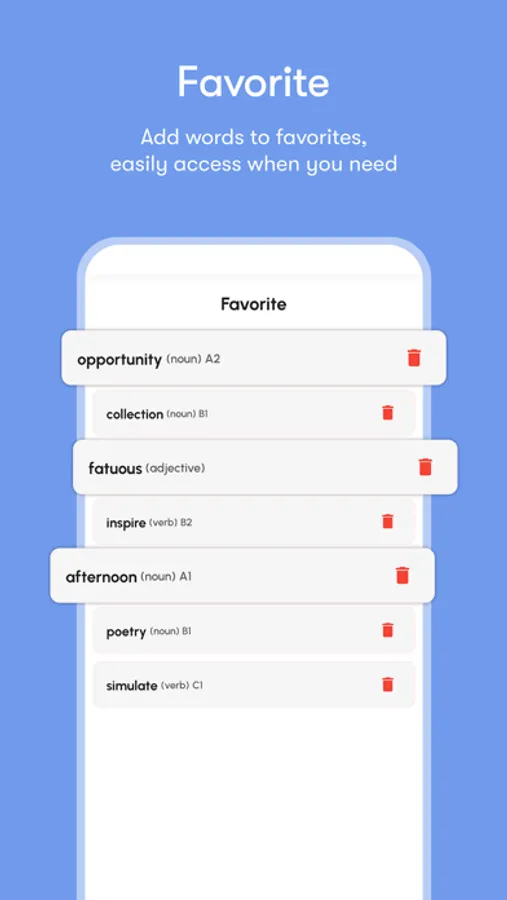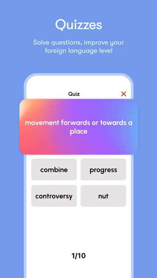 Facilitate vocabulary learning with flashcards. You can read the explanations of the words in their native language from the flashcards and learn the meanings of the words. You can test your vocabulary level and learn new words by solving quizzes. In this way, you can take your foreign language level to the next level.