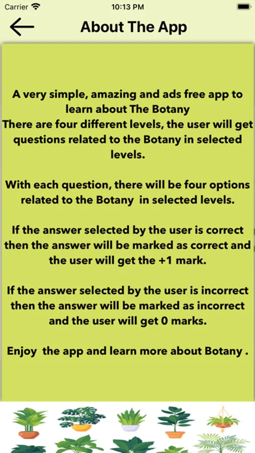 Il existe quatre niveaux différents, l'utilisateur recevra des questions liées à la botanique dans les niveaux sélectionnés.