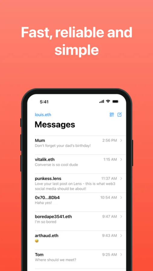 You choose your identity and the people you talk to. Whether your prefer to appear as a .eth profile or a .lens, we have got you covered. Reach out and message anyone, we can’t and we don’t want to censor you.