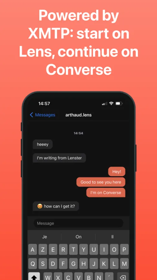 Your app is built on top of the XMTP protocol. Thanks to their magical technology, you can start a conversation on Lens and carry on the conversation in Converse. No more siloed conversations. It also means that if you don’t want to use converse anymore, you can leave with your conversations. It’s all good!