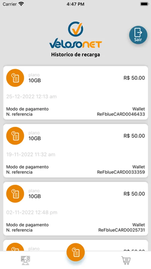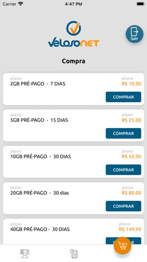 No aplicativo Veloso Móvel o usuário poderá visualizar seu consumo de dados, histórico de recargas.