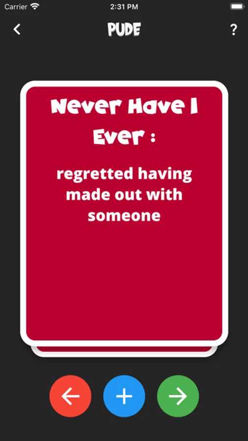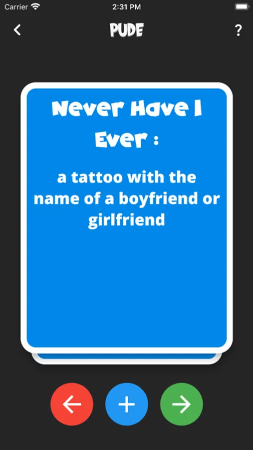 Unravel laughs and confessions with Pude, the app dedicated to the "Never Have I Ever" game that will shake up your gatherings! From light confessions to shocking revelations, Pude has been crafted to amplify laughter and fun at any get-together.