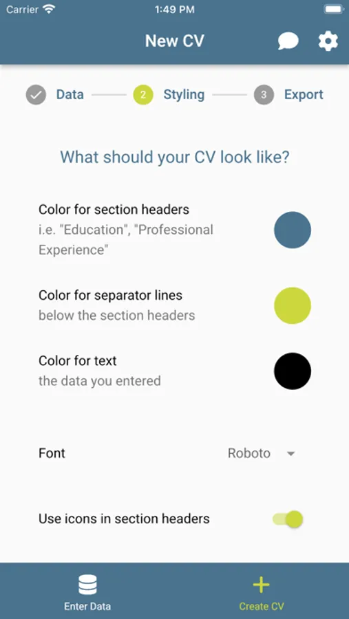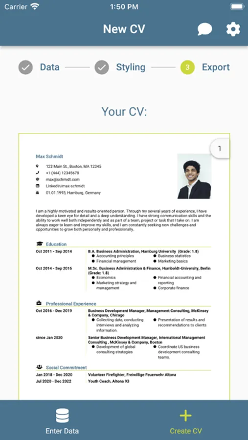 You don’t want to have the same boring CV as everyone else? With smartCV you can choose from various templates and customise colours and fonts.