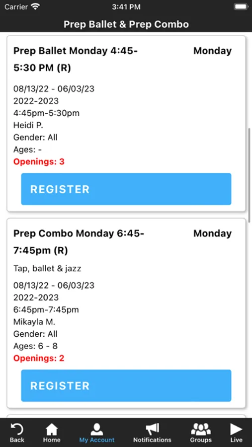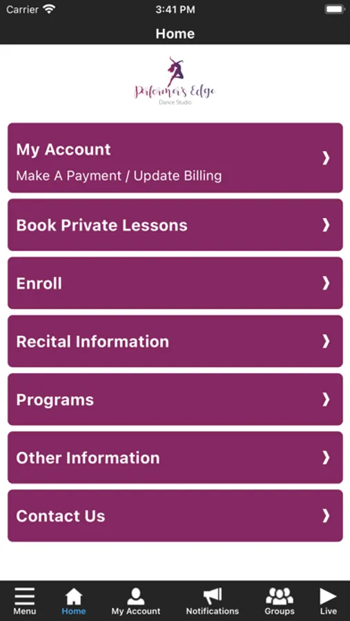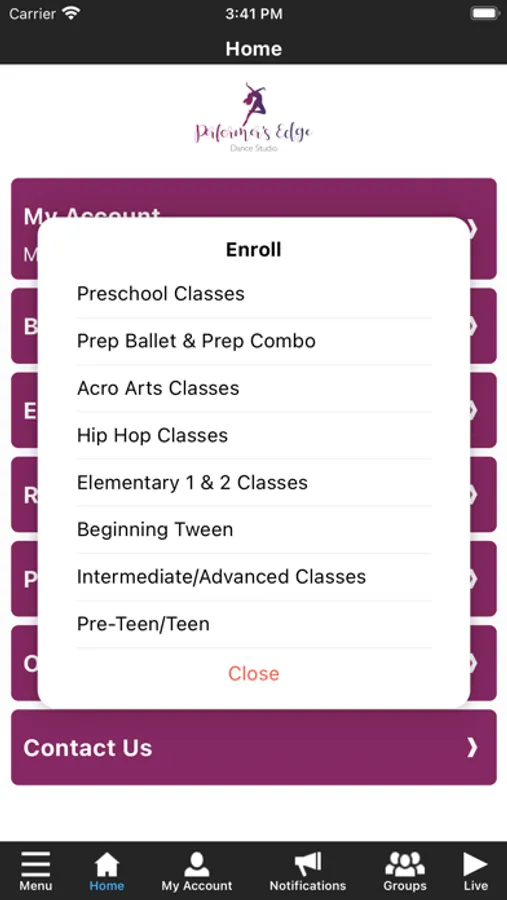 The Performer's Edge app allows you to manage your account with ease, including registering for classes. You'll also receive important notifications about class changes, closings, registration openings, special announcements, and upcoming events.