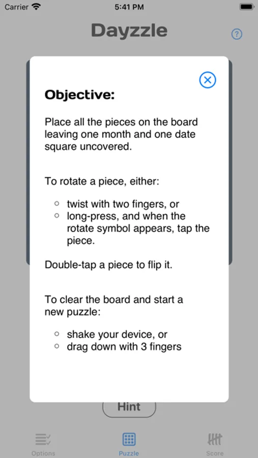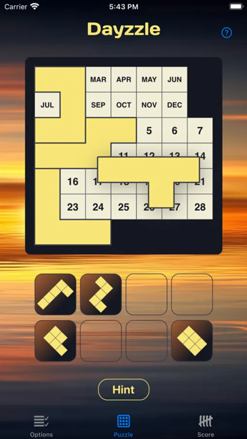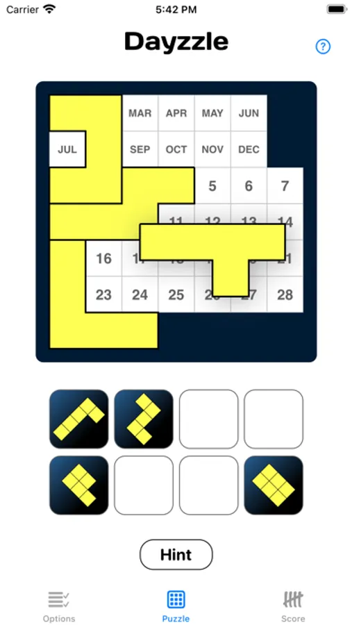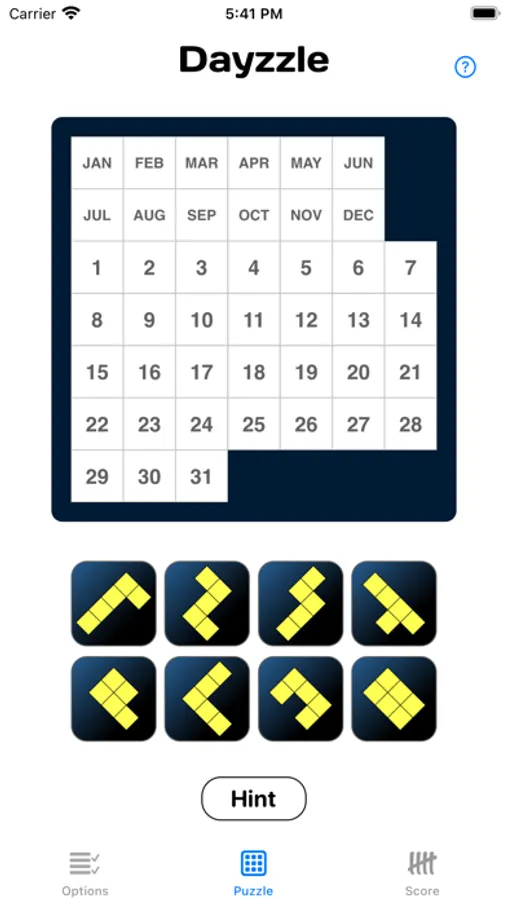 Dayzzle is a puzzle that challenges you to arrange a collection of shapes on a calendar grid, leaving a single date (month and day) exposed. Find a solution for today, and then start all over again tomorrow. Try to find a solution for every day of the month. Or, try to find every possible solution for today. If you're stuck, ask for a hint.