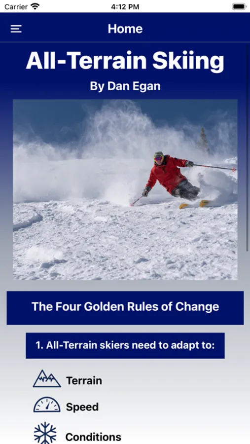All-Terrain Skiing II condenses extreme skiing pioneer Dan Egan’s 40 years of ski experience into an approachable guide to help skiers of all abilities take their skills to the next level. The app features video demonstrations and step-by-step instructions for thirty-one exercises so skiers can master their body mechanics and balance, from powder to ice and all the conditions and terrain in between. The All-Terrain Skiing II (ATS) program includes a book (also available as an ebook) and a demonstrative app. Whether you're a beginner or a pro, these resources will help you master your skiing mind, find expression in the mountains, and build your confidence. App users can purchase the book All Terrain Skiing II for more detail and description and then carry the app to the hill to practice.