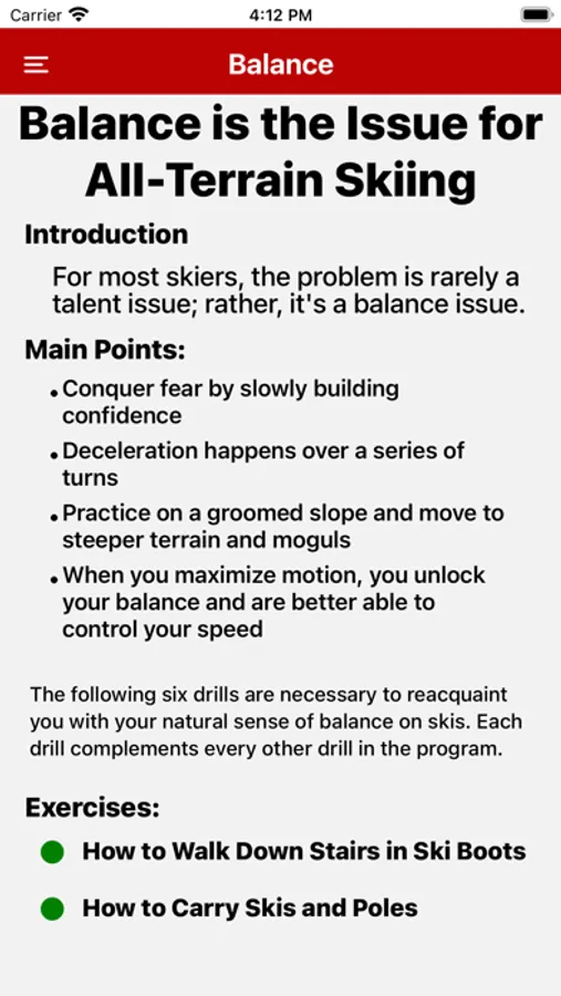 All-Terrain Skiing II is an integrated, self-contained program for beginning, intermediate, and advanced skiers—in other words, anyone who wants to learn to ski better. Lessons are identified with international trail marking symbols: Green Circle for beginners, Blue Square for intermediate, and Black Diamond for expert. In this ATS app, drills are also categorized to help you organize your lessons for quick access. These drills help you make body alignments while in motion, which ultimately increases your efficiency of motion and allows you to ski longer and with more control. The goal is to develop a new awareness of your relationship to gravity in a variety of ski conditions; to dynamically orient and angulate your body to maximize your control and efficiency; and to achieve constant fluid motion.