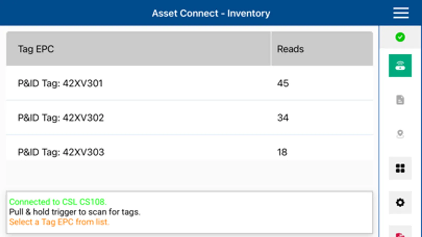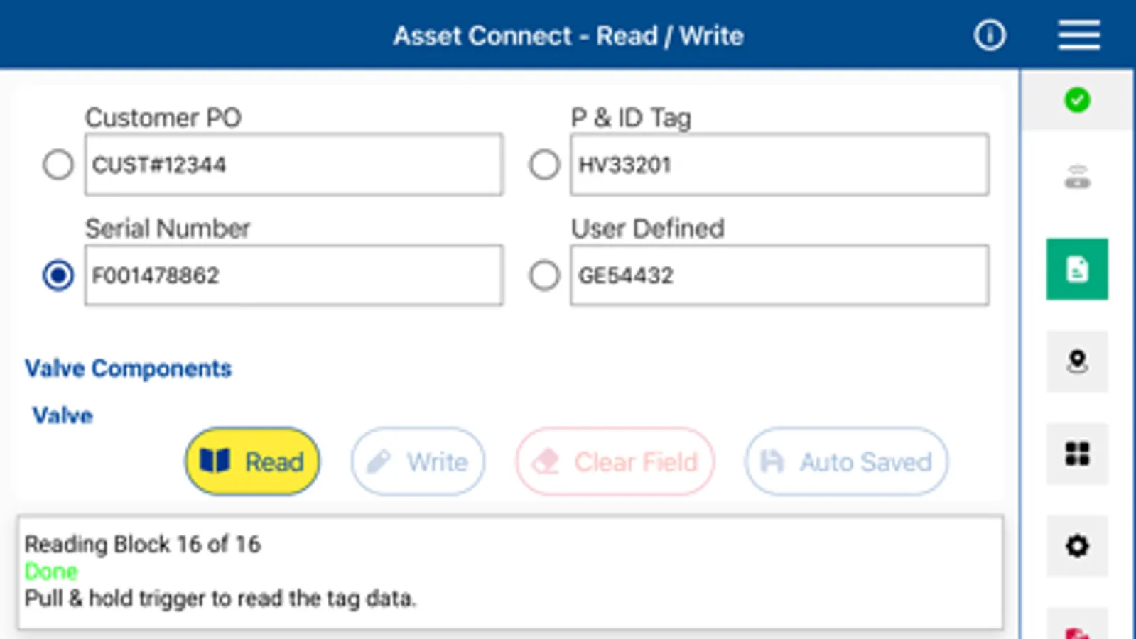 Asset Connect Software is used along with a handheld RFID reader to communicate with the Emerson Asset Management Tag. This provides the functions necessary for both reading and writing critical asset information and service details on the Asset Management Tag. Asset Connect Software communicates to the UHF RFID reader/writer using Bluetooth wireless technology.