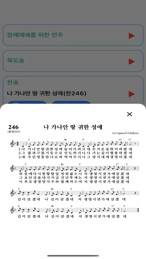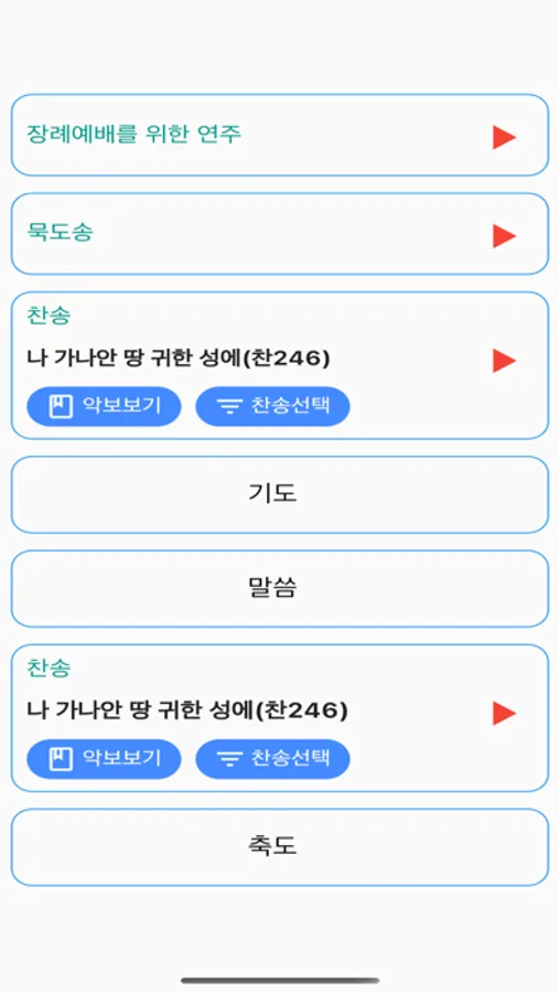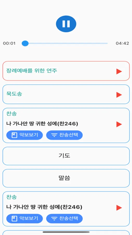예배 순서에 맞게 찬송가를 선정하여 음원 및 악보를 미리 세팅 하여 예배를 진행할 수 있습니다.