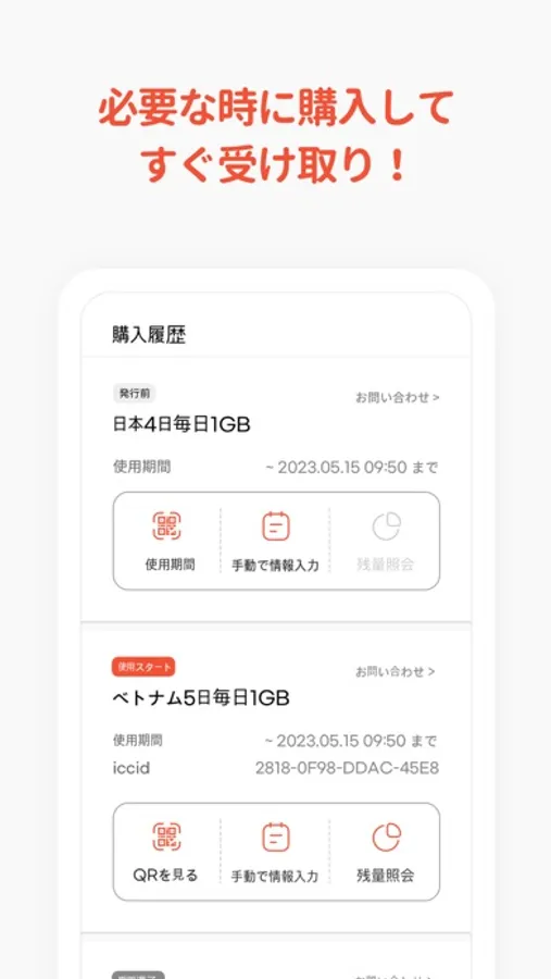 購入するとすぐにeSIM設定用のQRコードが届きます。必要な時、必要な分をQRコードスキャンだけでご利用いただけます。