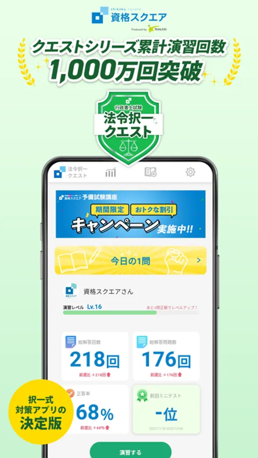 法律難関資格のオンライン学習サービス『資格スクエア』が独自に開発した、行政書士試験の択一式対策アプリです。他にはない効率的な学習を可能にする充実の演習機能やミニテスト&ランキング機能を搭載した行政書士試験択一式対策の決定版です。