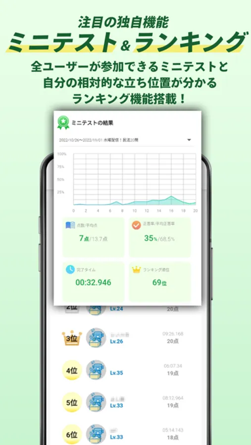 ・ミニテスト&ランキング:アプリ上で定期的に開催されるミニテストとランキングで他の受験生と比較した自分の相対的な位置がわかる!