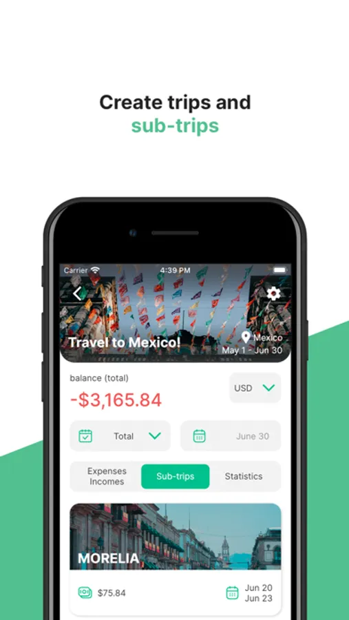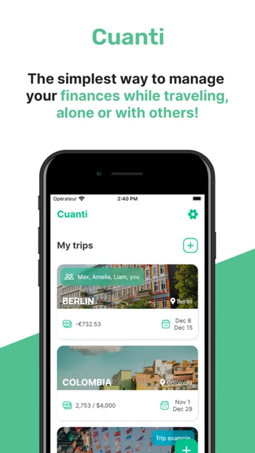 Cuanti uses a "Trip" and "Sub-trip" system. Each trip can be composed of several sub-trips to facilitate the distribution of expenses. You can assign a different currency for each trip and the amounts will be automatically translated into your reference currency.