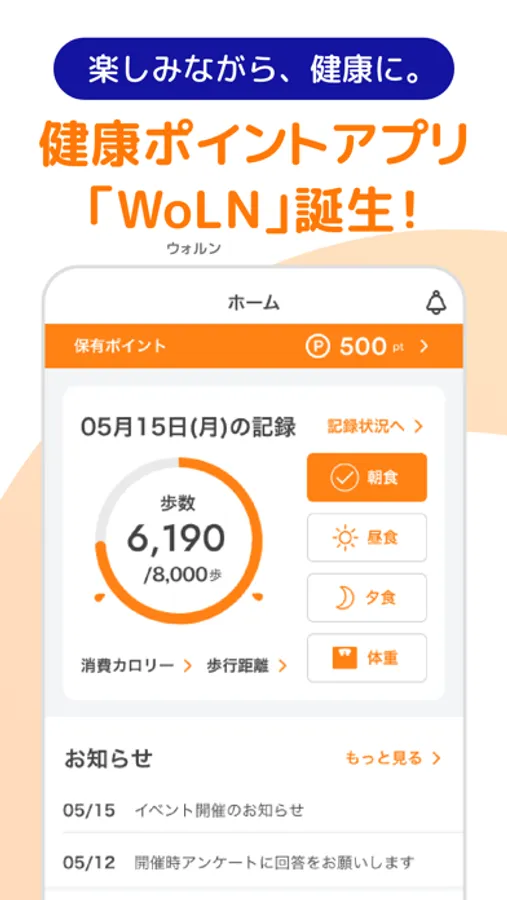 健康ポイントアプリ「WoLN」では、食事や運動、睡眠などの記録をしてポイントが貯まったり、健康プログラムにチャレンジしてポイントが貯まったり、健康的な行動に実践することでポイントが貯まる「楽しみながら、健康になれる」ことをコンセプトにしたアプリです。