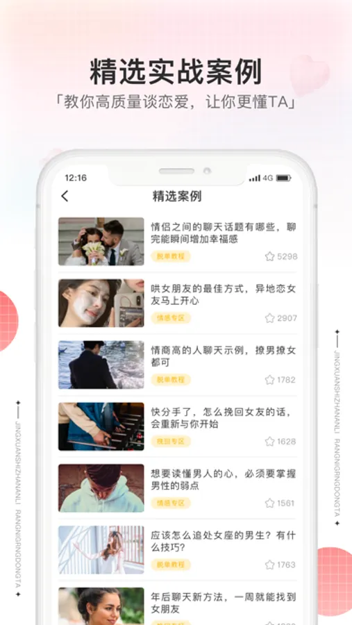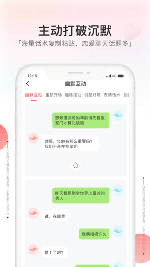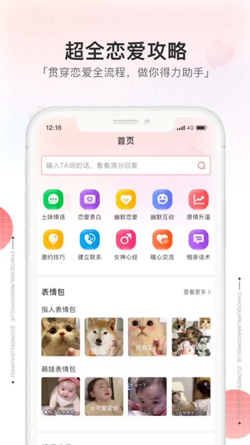 快来试试我们的软件,百万恋爱聊天话术高情商回复女生说的话,快速帮你提高恋爱情商,全心全意教你谈恋爱,恋爱妙招,助你在爱情之路巧妙化解难题。搜索追女生的情话代聊回答!让你不用动脑筋!只需要搜话术聊天就能吸引女生,提高你的情商,从此聊天不冷场!帮助您早日找到理想的女朋友,过上幸福生活!让您的青春不在单身中度过!
