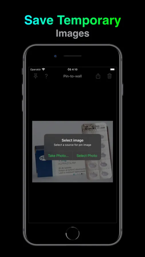 Temporarily save/show photos. Pin pictures to home screen and store temporarily. This application will only keep one photo in its memory unless you delete it. If you select or take a new photo, it will delete the old one. In this way, unnecessary photos will not take up space on your device and you will not have to delete them. If you change your mind about the picture before deleting it, you can press the share button and save the picture.