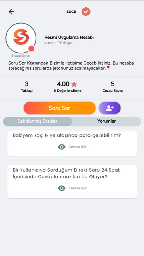 Soce soru cevap uygulamasında; sorunuzu soracağınız meslek ya da üniversite adını arama kısmına yazdığınızda; uygulamıza kaydolmuş kullanıcılarımızın tek tek profillerine tıklayarak, ilgili profilin ratingine, değerlendirme sayısına, yorumlarına ve ücret bilgisine dikkat ederek en sağlıklı seçimi yapabilirsiniz.