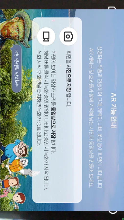 AR모드를 통해 고래, 나비, 꽃잎 등과 사진 및 동영상 촬영이 가능합니다.
