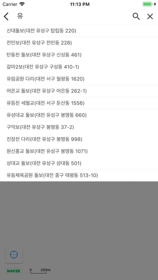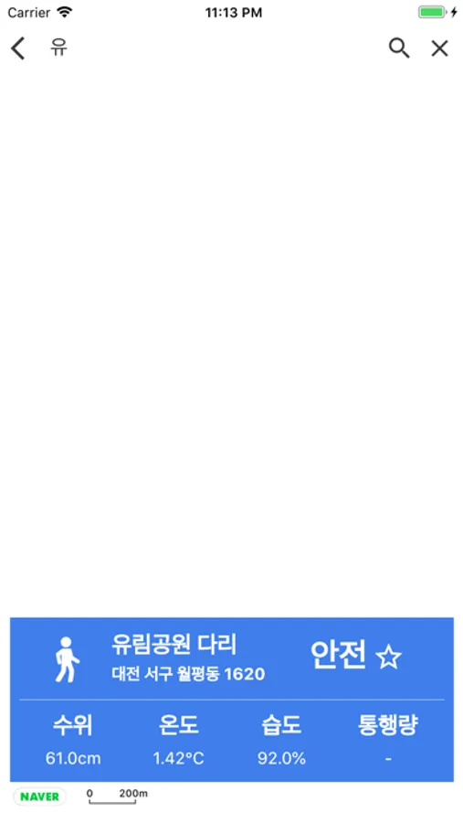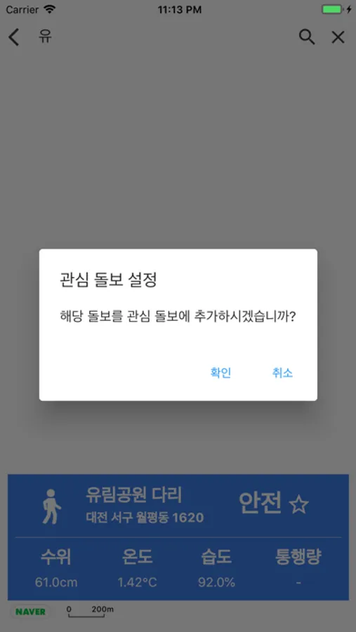 대전 3대 하천 내 돌보의 범람 여부 등 통행이 불가능한 상황을 실시간 수집하여 신속하게 시민들에게 제공합니다.