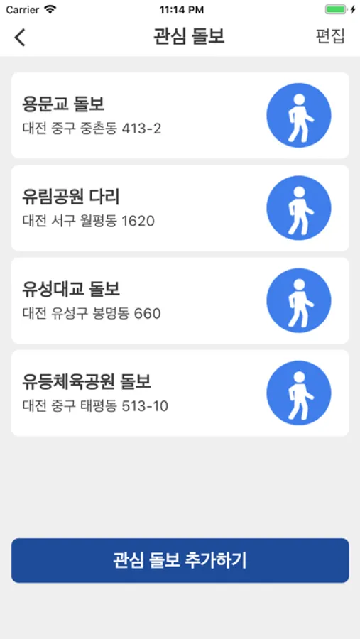 이용자가 자주 이용하는 돌보를 관심 돌보로 설정하여 빠르게 정보를 확인할 수 있습니다.