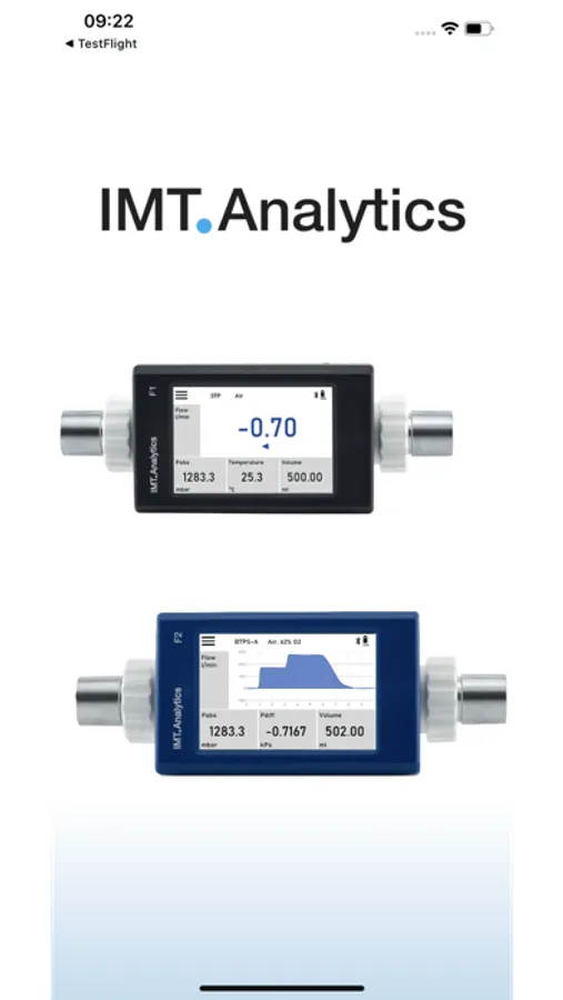 View, record and record data from flow meter devices F1 and F2 via Bluetooth. IMT Analytics is a Switzerland based manufacturer of gas flow analyzers, flow meters and test lungs capable of testing a wide range of medical devices such as respiratory and anesthesia devices, oxygen flow meters, pressure gauges and suction devices. www.imtanalytics.com