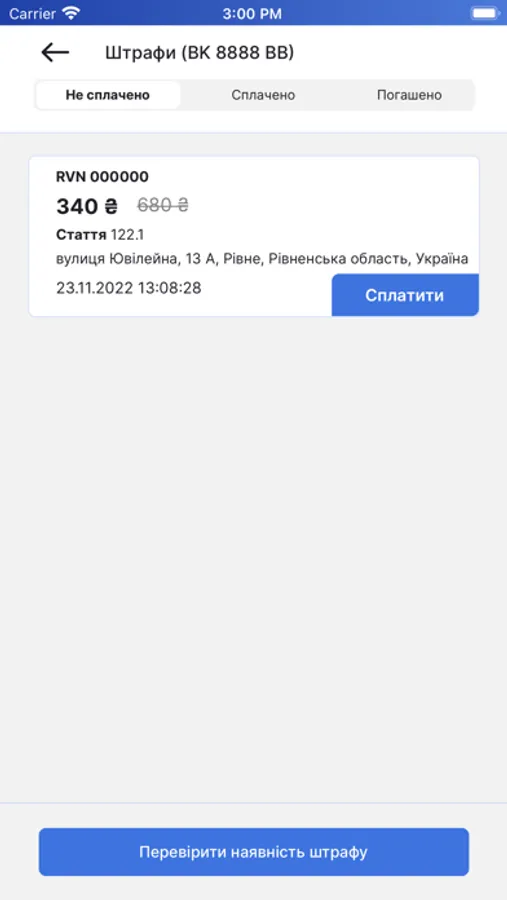 - search for existing fines for violation of the Road Traffic Rules (TDR) in accordance with the Code of Administrative Offenses;