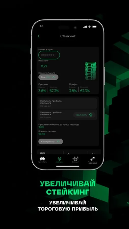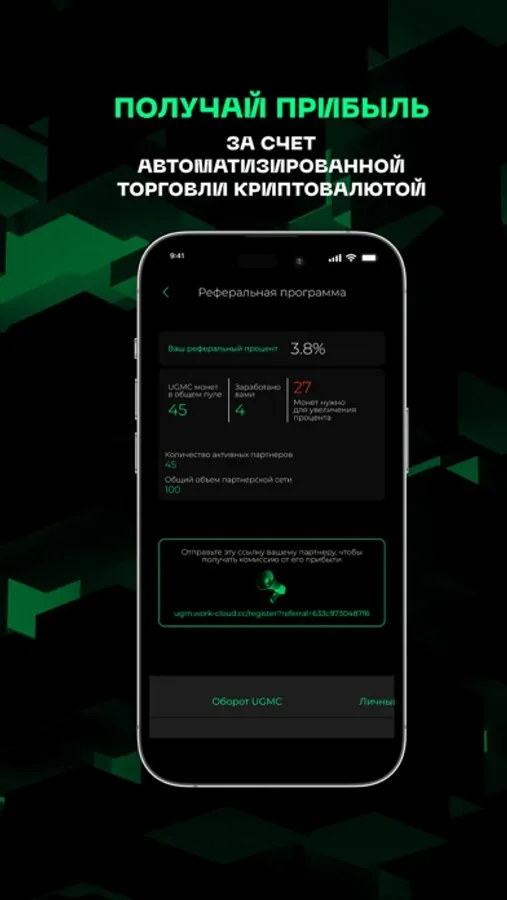In our project, each user gets the opportunity to make a profit using automated cryptocurrency trading and staking  token UGM. The token was developed according to the PoS algorithm on BSC, and  alsow developed ranking system. The more tokens in the pool, the greater the staking accrual and the more profitable cryptocurrency trading. The technology is based on the strategy of grid trading and arbitrage trading at the same time. Also, each user, by increasing the rank in the staking pool, increases the plus fee for limit orders.
