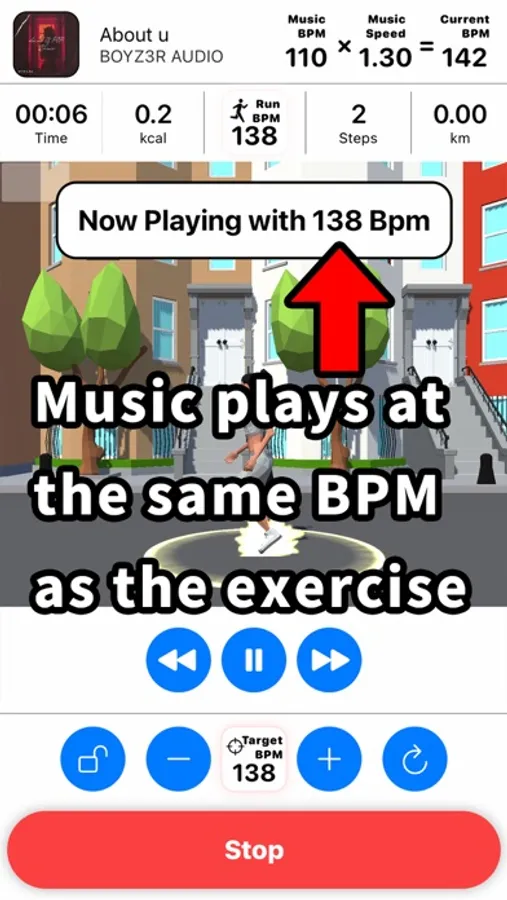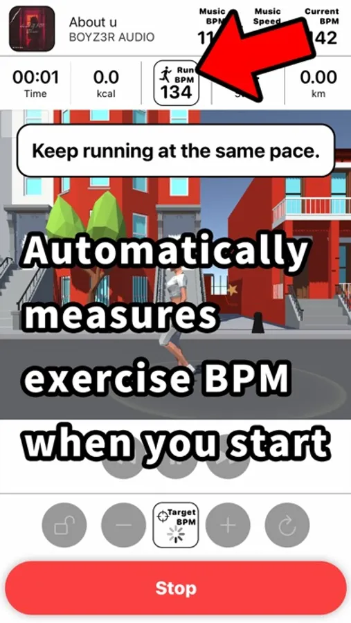 When you start running, the app automatically measures the rhythm of your exercise (=BPM). Music is played in accordance with that BPM.