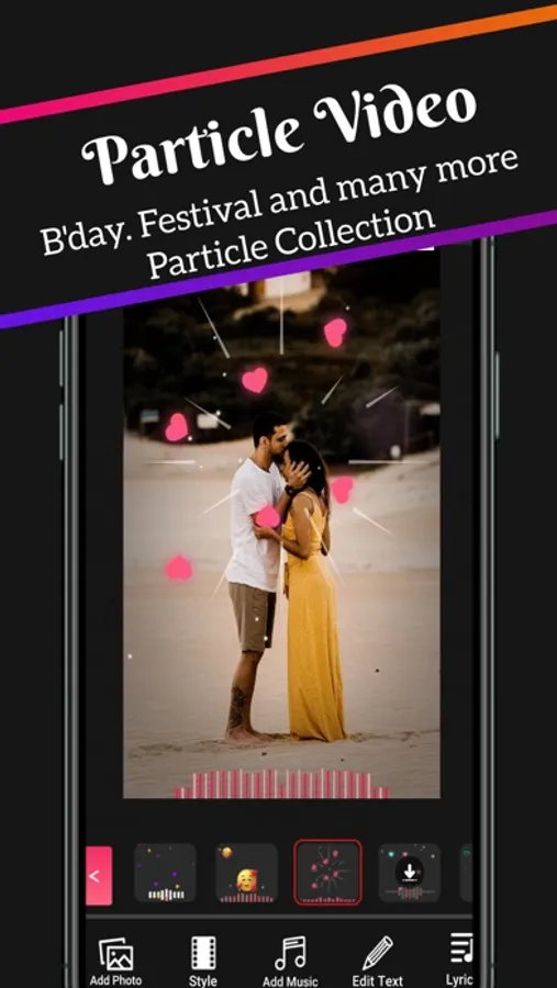 You can create animated Photo Video Maker with Beat wise particles effects with your favorite song track.