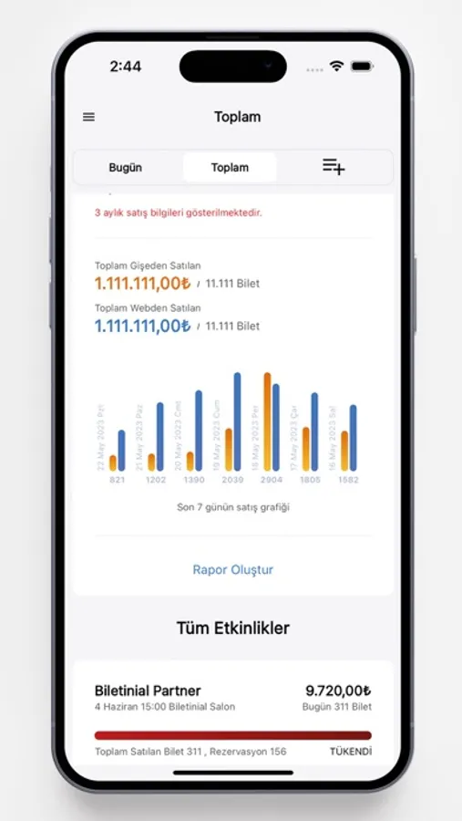 With Biletinial application, your experience of buying tickets for concerts, theaters, movies, education, football, basketball, volleyball and much more that you want to go with an ease that you have never experienced before is waiting for you. Biletinial partner is the report application we have developed for the organizers we serve.