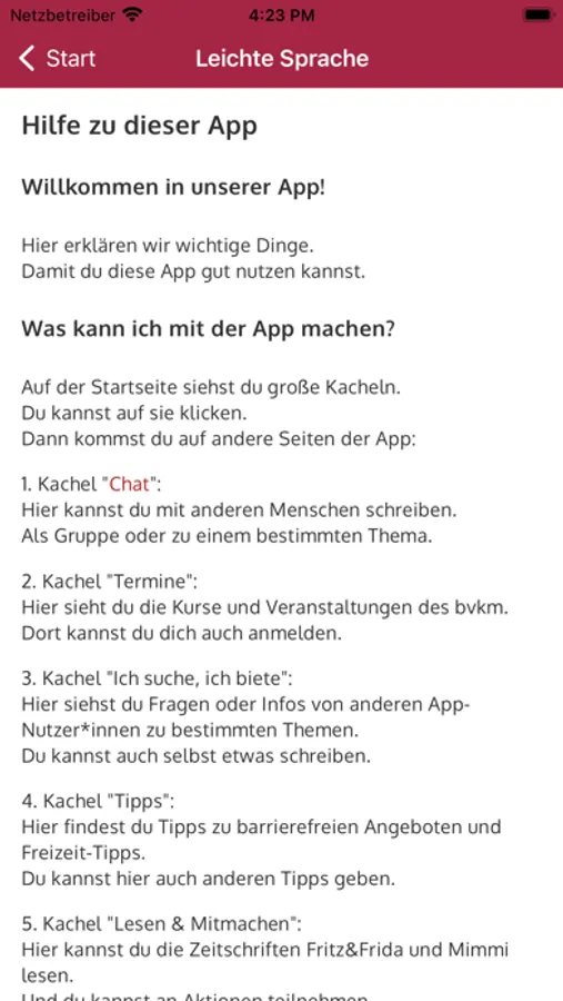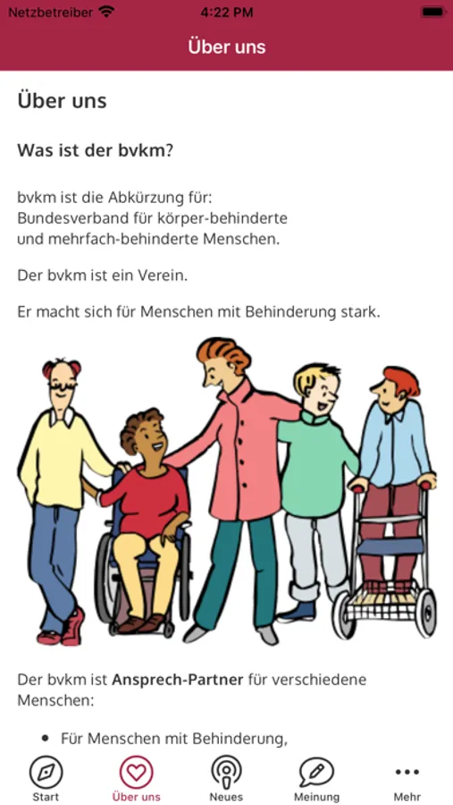 DIE App für Menschen mit Behinderung. Hier werden Tipps ausgetauscht und Menschen vernetzt. Wir informieren über Themen, die mit Behinderung zu tun haben, laden zum Mitmachen ein und wollen eure Meinung hören. Durch Sofort-Nachrichten verpasst man keine Veranstaltungen, Aktionen, Zeitschriften etc. In der App kann man ganz einfach mitmachen: über Themen diskutieren, Tipps austauschen, Beiträge und Kontaktanzeigen für die Zeitschriften des bvkm einreichen und vieles mehr. Die App hilft bei Veranstaltungen: man hat alle Infos (Ort, Programm, Infos, Gästebuch) immer in der Tasche. Und man erfährt etwas über die Interessen-Vertretung (Bundesvertretung der Clubs und Gruppen) im bvkm: Welche Menschen dahinterstecken und was sie machen. Wir versuchen, die Barrieren weiter abzubauen. Unterstützt uns durch Rückmeldungen zur App gerne dabei!