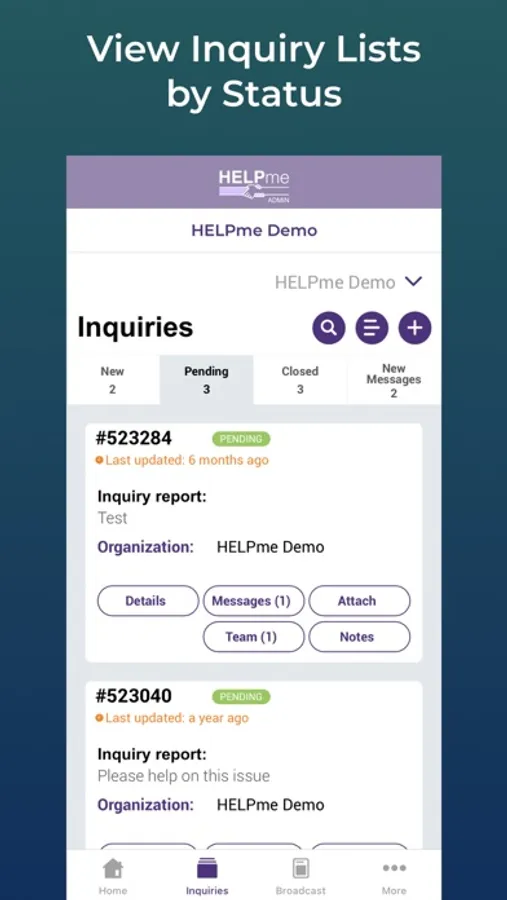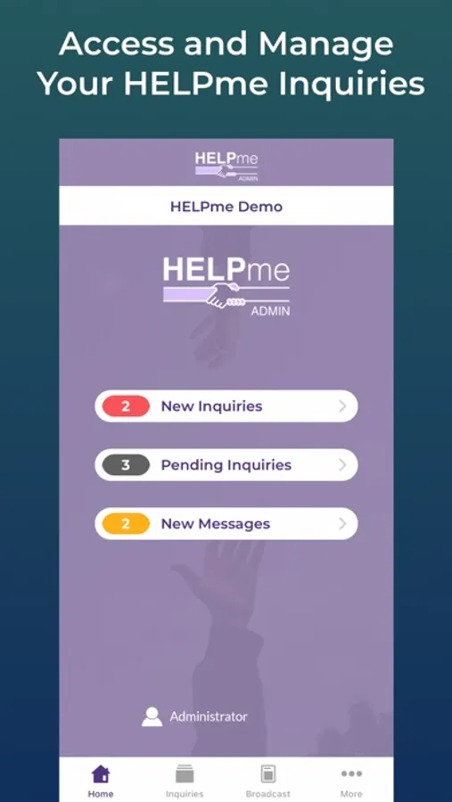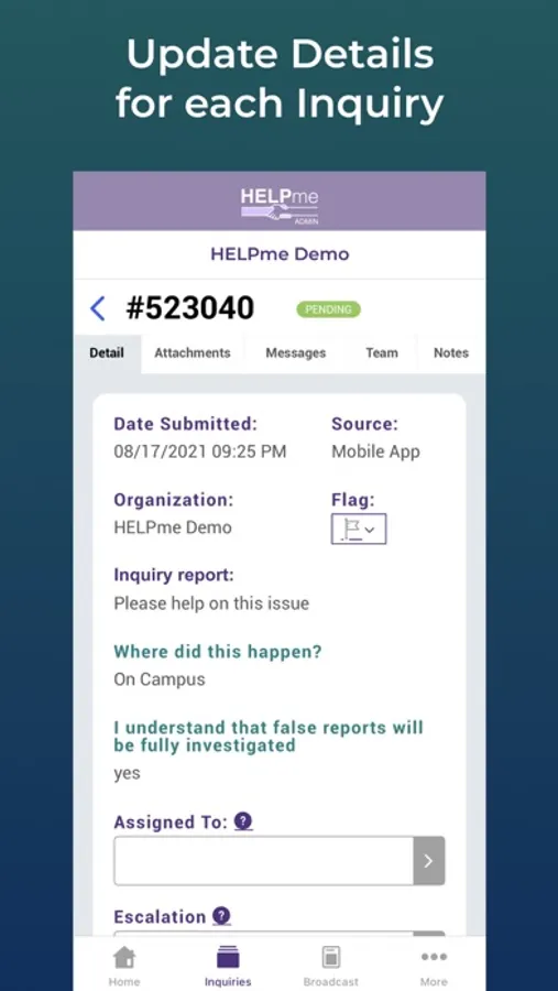 The HELPme Admin app allows authorized HELPme administrators to access and manage inquiries from their mobile devices. All of the inquiry management features of the desktop interface are available in the app: