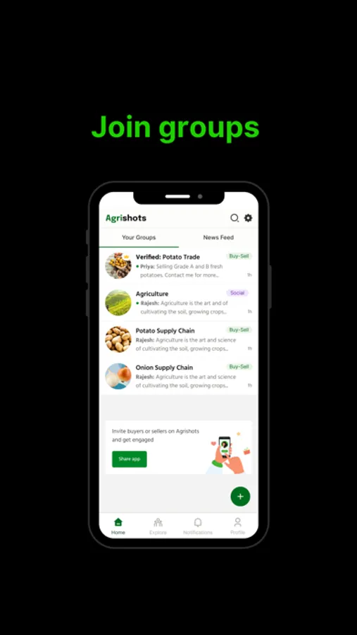Agrishots a B2B marketplace for agriculture commodities in India for buyers and sellers to connect and trade with transparency. Our platform has commodity based groups where buyers/sellers can post their supply/demand with details such as commodity, photo, quality, quantity, price, location, payment acceptance criteria and description. Buyers/sellers can rate & give review to each other to build credibility. We also have verified groups which is only for verified users. We provide end-to-end transaction support including logistics with order tracking & payments.